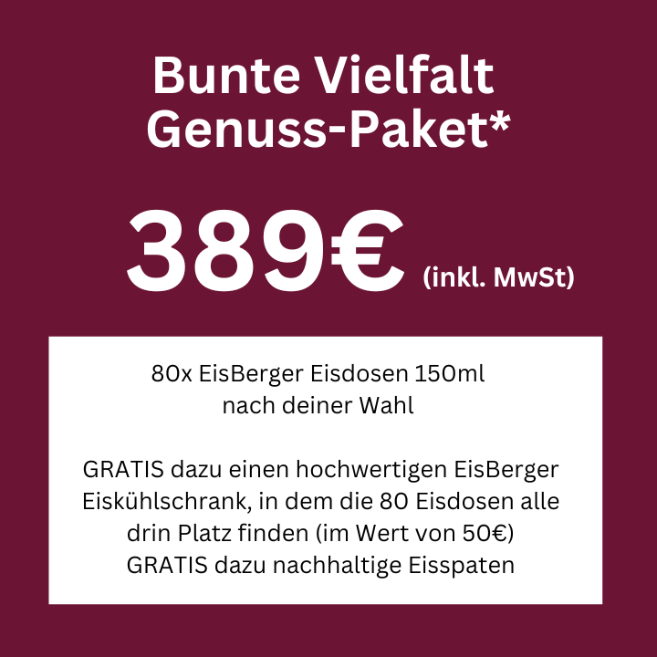 Entdecke die bunte Vielfalt unseres Genuss-Pakets! Mit diesem Paket erhältst du 80 x EisBerger Eisdosen à 150ml nach deiner Wahl – ideal für jeden Geschmack! Als besonderes Highlight bekommst du GRATIS einen hochwertigen EisBerger Eiskühlschrank dazu, der Platz für alle 80 Eisdosen bietet (im Wert von 50€). Außerdem sind nachhaltige Eisspaten im Paket enthalten, damit du umweltfreundlich genießen kannst. Nutze diese einmalige Gelegenheit und sichere dir dein Paket zum Aktionspreis!