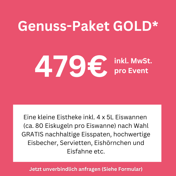 Erlebe den ultimativen Eisspaß mit unserem Genuss-Paket GOLD! Dieses Paket beinhaltet eine kleine Eistheke, die mit 4 x 5L Eiswannen gefüllt ist – das entspricht ca. 80 Eiskugeln pro Wanne! Du hast die freie Wahl bei der Auswahl deiner Lieblingssorten. Zusätzlich erhältst du GRATIS nachhaltige Eisspaten, hochwertige Eisbecher, Servietten, Eishörnchen und eine Eisfahne, um dein Event perfekt zu gestalten. Lass dir diese köstliche Gelegenheit nicht entgehen und frage jetzt unverbindlich über unser Formular an!